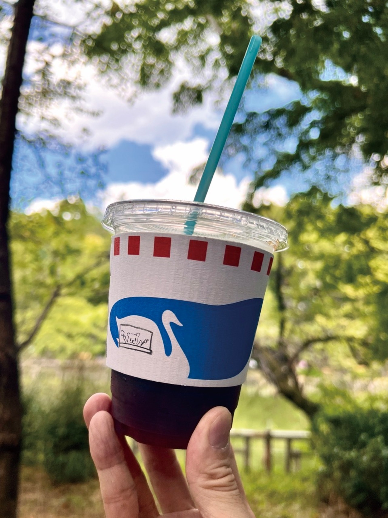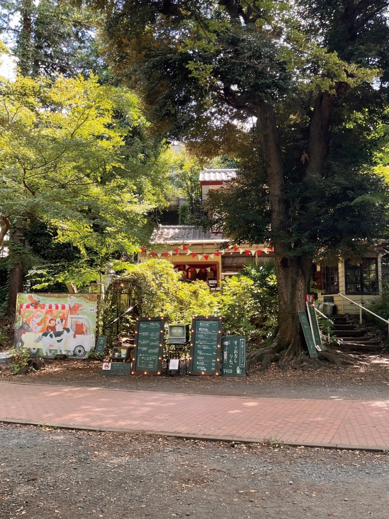 井の頭公園内の木々に囲まれた小さなコーヒースタンド。お店の内外いたるところにクマちゃん含む動物たちのイラストが描かれており、装飾のガーランドとともにメルヘンな空気を醸している。池のほとりのベンチでネコドーナツとコーヒーを楽しむ時間は至福。